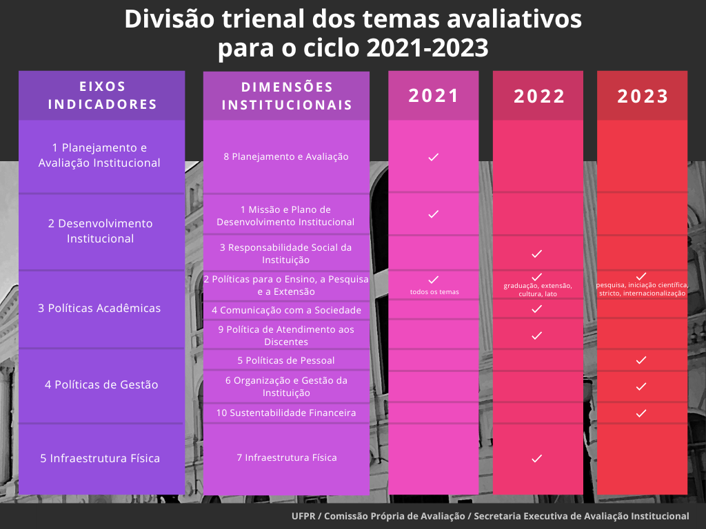 Por essa razão, em 2021, a CPA aprovou a organização dos eixos e dimensões também de forma trienal. A nova organização visa atender à proposta do Sinaes e melhorar o aprofundamento da avaliação das diversas políticas, programas e serviços institucionais, tornando os instrumentos de pesquisa menos cansativos e extensos.