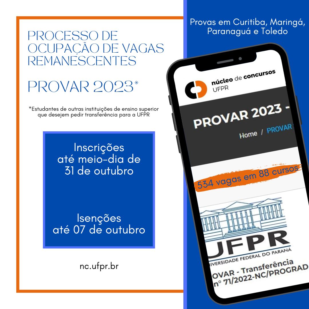 Para facilitar a vida dos estudantes universitários que querem se transferir para a UFPR, a prova da modalidade Transferência do Programa de Ocupação de Vagas Remanescentes (PROVAR 2023) será realizada em quatro cidades: Curitiba, Paranaguá, Toledo e Maringá. O PROVAR 2023 oferta 534 vagas para transferência de alunos de outras instituições e as inscrições ficam abertas até 31 de outubro.