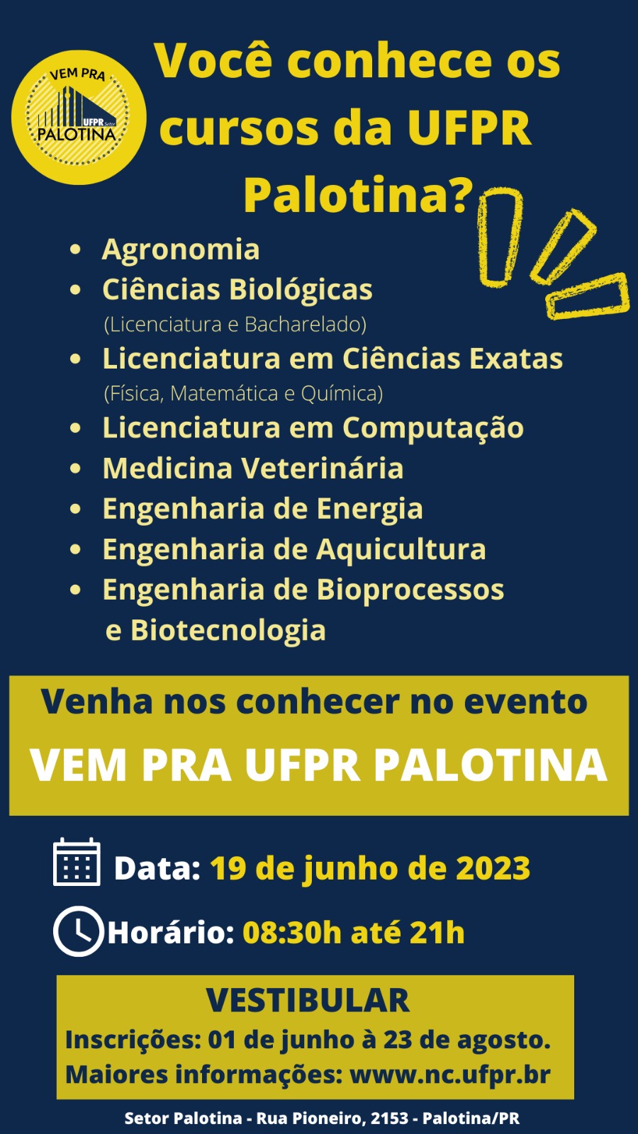Vem aí mais uma edição do evento “VEM PRA UFPR Palotina” cujo objetivo principal é apresentar a UFPR Palotina aos estudantes e comunidade em geral.